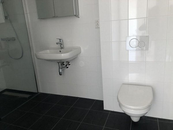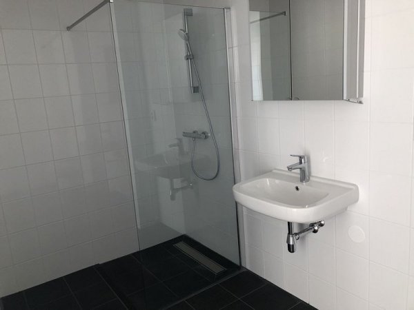 * Badkamer met inloopdouche, wastafel met spiegelkast en zwevend toilet