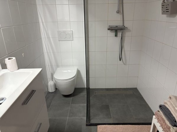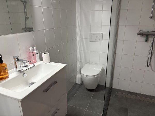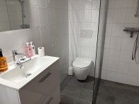 * Badkamer met inloop douche, zwevend toilet, wastafel met spiegelkast.
